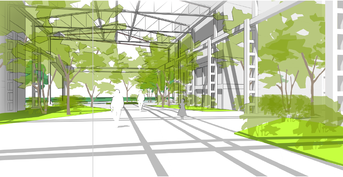 La charpente métallique réemployée permettra d’ombrager la nouvelle rue, de permettre à de la végétation de grimper sur la structure, et de conserver des éléments patrimoniaux dans le secteur.