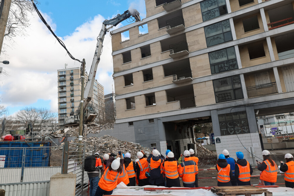 Lors de cette visite presse, les journalistes ont pu assister à des séquences de déconstruction en cours et observer les méthodes de dépose sélective mises en œuvre pour préserver les matériaux destinés au réemploi.
